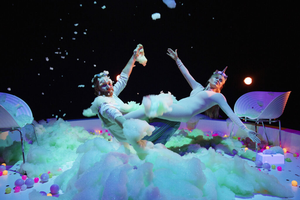 Toneelschrijver Jibbe Willems heeft de gekunstelde dialogen slim volgestopt met scherp en grappig commentaar op veelbesproken fenomenen als femicide en gaslighting, prestatiedruk en prio’s stellen. (Volkskrant ★★★★)